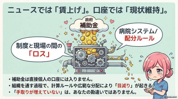 ニュースで「政府が医療・介護職の賃上げ(処遇改善)を決めた」と聞くと、世間は「看護師さんの給料が上がるんだな、良かった」と思います。しかし、現場からは「全然手取りが増えていない」という声が絶えません。 なぜなら、国から出た補助金がそのまま個人の口座に振り込まれるわけではないからです。病院や施設という「組織」を通す過程で、複雑な計算ルールがあったり、他の職種のスタッフにも広く薄く分配されたりして、現場の看護師の基本給アップには直結しにくいという「制度のロス(目減り)」が起きています。