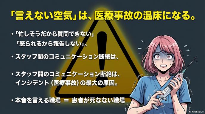 「こんなことを言ったら怒られるかもしれない」「忙しそうだから質問できない」……。Xの投稿にもあったような、感情を殺し、理不尽に耐えるのが当たり前の職場では、スタッフ間のコミュニケーションが極端に減ります。 医療現場では、この「ちょっとした確認不足」が命取りになります。「あの薬の指示、なんだかおかしい気がする」と気づいても、医師や先輩に意見が言えない。その結果、防げたはずの医療事故(インシデント)が起きてしまう。本音が言えない空気は、そのまま「医療安全の低下」に直結しているのです。