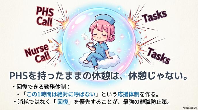 師長さんや病院の経営層が明日からできる最大の支援は、「名ばかりの休憩」をなくすことです。 休憩室にいてもナースコールやPHSが鳴りやまない状態は、脳が休まっておらず「休憩」とは呼べません。「この1時間は絶対に呼ばない(他のスタッフでカバーする)」という応援体制を本気で作ること。 そして、有給休暇の消化や、夜勤明けの十分な睡眠時間の確保など、スタッフが「消耗」ではなく「回復」できる勤務体制を最優先にすることです。これが結果的に、一番の離職防止策(=採用コストの削減)になります。