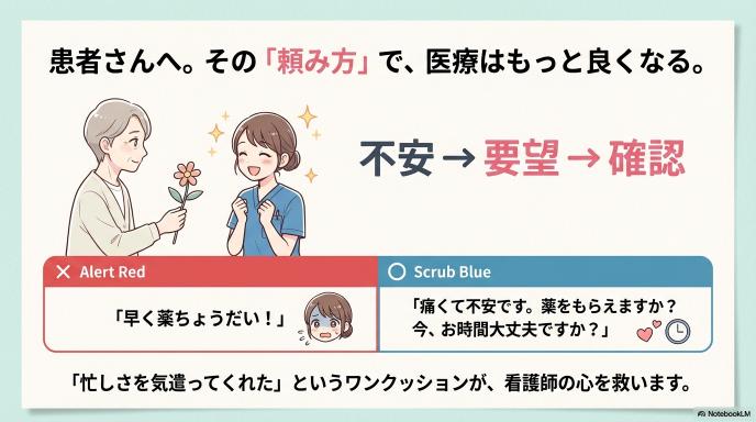 一般の私たちが病院にかかるときも、医療者をすり減らさないための工夫ができます。それは「頼み方」です。 痛みや不安があると、つい「早く薬ちょうだい!」と強い口調になってしまいがちです。これを、「痛みが強くて不安です(不安の共有)」「痛み止めをもらえませんか?(要望)」「今、お時間大丈夫ですか?(相手の状況確認)」という順番に変えてみてください。 「自分の忙しさを気遣ってくれた」というワンクッションがあるだけで、看護師側の精神的なストレスは劇的に下がり、お互いに気持ちよくコミュニケーションが取れるようになります。