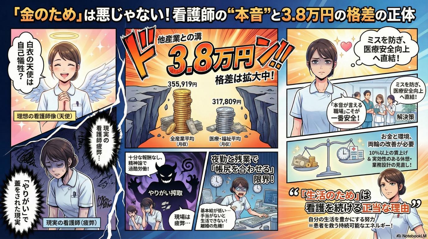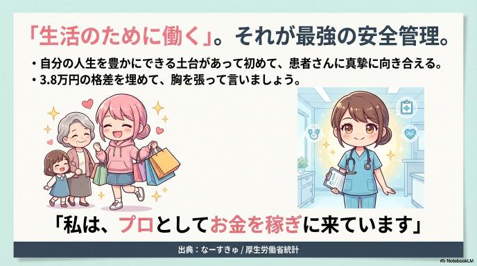 Xで共感を呼んだ「本当は家族を養うため、自分の好きな物を自由に買うために頑張っている」という言葉。これを「素晴らしい」と肯定できる社会こそが、これからの医療を支えます。 給料(お金)は、労働に対する正当な対価です。他産業との3.8万円の格差を埋め、しっかりと自分の人生を豊かにできる土台があって初めて、患者さんへ真摯に向き合うエネルギーが生まれるのです。