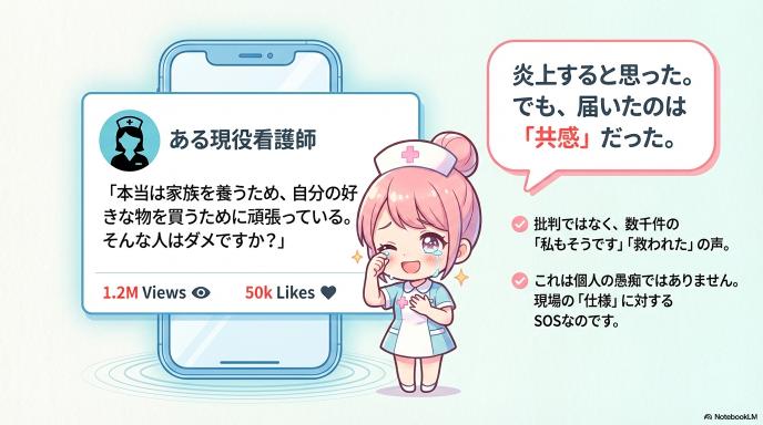 この「炎上覚悟」の告白に集まったのは、批判ではなく、数千件もの「私もそうです」「救われた」という共感の嵐でした。なぜ今、これほどまでに看護師たちの「本音」が噴き出しているのか。