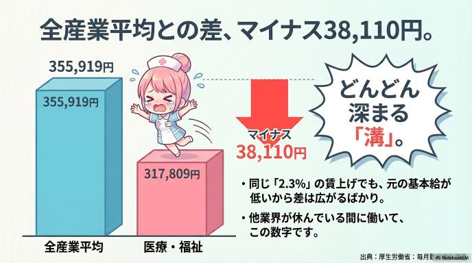全産業平均 (355,919円) – 医療・福祉平均 (317,809円) = 38,110円