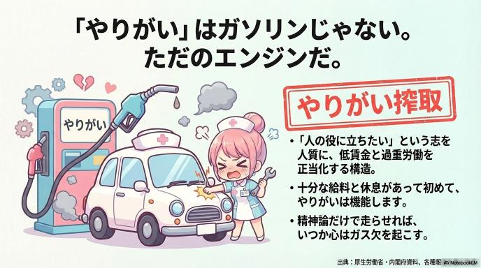 よく「最近の若い看護師はやりがいを感じていない」といった声を聞くことがありますが、それは少し違います。最初は誰もが「人の役に立ちたい」という志を持って現場に入ってきます。 問題なのは、その「やりがい」を燃料にして、過酷な労働環境や低賃金を我慢させようとする構造です。これを「やりがい搾取」と呼びます。 やりがいは、十分なお給料としっかりした休息があって初めて、前向きなエネルギーとして機能します。それが満たされないまま精神論だけで走らされれば、どんなに強い志を持っていても、いつか心が「ガス欠」を起こしてしまうのは当然のことです。