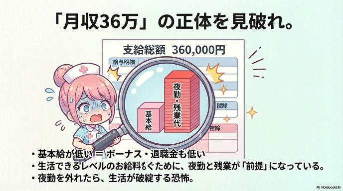 給与明細を見ると、そのからくりが分かります。「36万円」というのは、基本給(ベースとなるお給料)に、夜勤手当、資格手当、そして残業代など、すべてをひっくるめた額面上の数字です。 実は、基本給だけを見ると、全産業の平均と大差ない、あるいはそれ以下というケースが珍しくありません。基本給が低いということは、ボーナス(基本給の〇ヶ月分で計算されることが多い)や退職金も低く抑えられてしまうという、隠れたデメリットを抱えているのです。