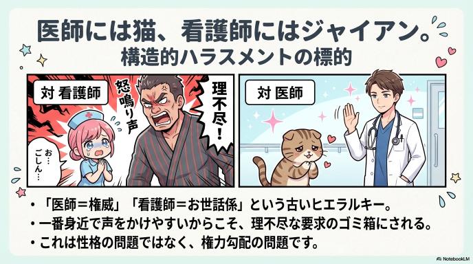 小児科医の方の投稿にあった「看護師にはジャイアンのように振る舞うのに、医師が出てきた途端に借りてきた猫のようになる」現象。これは多くの看護師が頷く「あるある」です。 患者さんやその家族の中にある「医師=権威」「看護師=お世話をしてくれる人」という古いヒエラルキーの意識が、一番身近で声をかけやすい看護師に八つ当たりや理不尽な要求を集中させています。これは個人の性格の問題ではなく、医療現場の力関係が生み出す「構造的なハラスメント」と言えます。