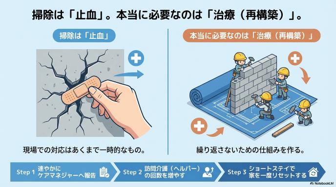 - ③ゴミで動線がない: 万が一の救急搬送時にストレッチャーが入らない、あるいは患者さん自身が転倒する重大なリスクがある。 こうした命や安全に関わる状況に直面したとき、医療者は「緊急避難としての最小限の清掃(感染防止や動線確保)」を行うことはあっても、それを「恒常的な家事代行」にしてはいけません。危機の連鎖を断ち切るための「一時的な止血」と、根本的な「生活の立て直し」は明確に分けて対応を考える必要があるのです。