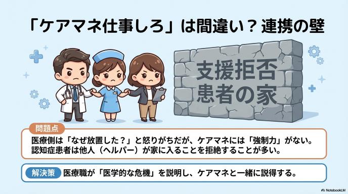「自分たちの仕事ではないから」と、医療職からケアマネジャーへ一方的に丸投げ(匙を投げる)してしまえば、チーム連携は完全に崩壊します。医療職が見つけた「生活の破綻」は、ケアマネジャーにとってもサービスを見直すための重要なカード(根拠)になります。「ケアマネ何やってるの?」と責めるのではなく、「医療的な危機(感染・転倒リスク)が迫っているから、これを理由に一緒に本人を説得しましょう」と、互いの専門性を持ち寄って巻き込んでいく姿勢こそが求められているのです。