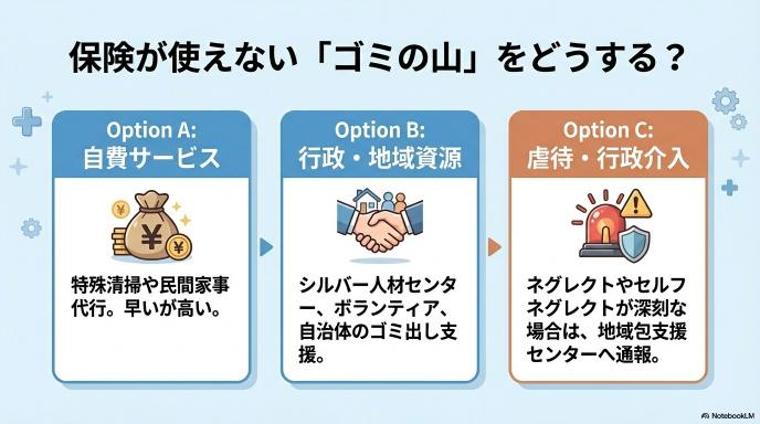 介護保険ではカバーしきれない「長年蓄積したゴミの山」や「染み付いた排泄物の大掃除」は、別のルートで解決する必要があります。経済的な余裕があれば民間の「自費清掃サービス(特殊清掃やハウスクリーニング)」を手配します。費用捻出が難しい場合は、自治体の高齢者向けゴミ出し支援制度、シルバー人材センター、地域のボランティア団体などをケアマネジャーや地域包括支援センターと相談しながら活用し、まずは「ベースとなる清潔な環境」を一度リセットする働きかけを行います。