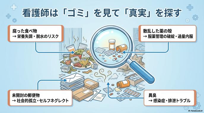 部屋の荒れ具合は、水面下で起きている問題の氷山の一角です。看護師は、ゴミの山や異臭の中に「SOSのサイン」を探します。例えば、キッチンに腐った食べ物があれば「栄養失調や脱水」を疑い、テーブルに薬の空き殻が散乱していれば「服薬管理の破綻」を察知します。また、郵便物が溜まっていれば受診中断や社会的な孤立(セルフネグレクト)を疑います。単に部屋を綺麗にするだけでなく、その背景にある「命の危険」をアセスメント(評価)し、次の一手を打つことこそが、看護師が現場に入る最大の価値なのです。