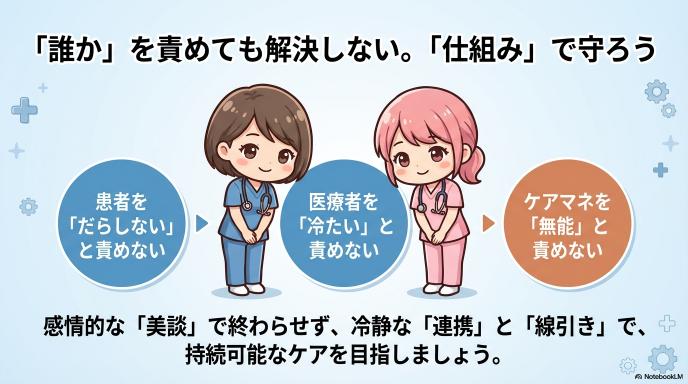 まず避けたいのは、「こんなになるまで放っておくなんて、だらしない」といった患者さんやご家族への**「患者責め」です。認知症や機能低下という背景を見落としてしまいます。また、「医師が掃除なんてするべきじゃない」「ケアマネは何をしていたんだ」といった「職種責め」**も本質からズレてしまいます。それぞれの職種が限られた制度と時間の中でギリギリの戦いをしているからです。「〇〇すべきだ」「〇〇は絶対におかしい」といった白黒つける断定的な表現は、複雑な在宅医療の現場には馴染みません。