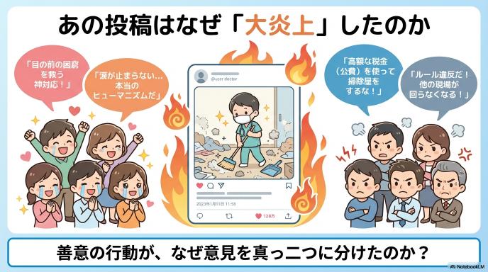 賛成や称賛の声の根底にあるのは、「目の前で困窮している患者を見捨てなかった」という医療者に対する純粋な感動です。 糞尿まみれの環境に放置されれば、深刻な皮膚炎や感染症のリスクが跳ね上がります。また、何よりご本人の「人としての尊厳」が傷つけられた状態です。「本来の業務ではない」と目を背けるのは簡単ですが、ひとまずその日の命と衛生を守るために、緊急避難的に大掃除を決行した行動力と温かい善意は、医療の枠を超えたヒューマニティとして高く評価されるべき側面を持っています。