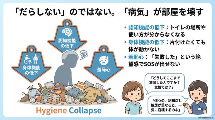 「部屋が汚いだけ」と侮ってはいけません。在宅ケアにおいて、生活環境の悪化はそのまま患者さんの命や病状の悪化に直結します。