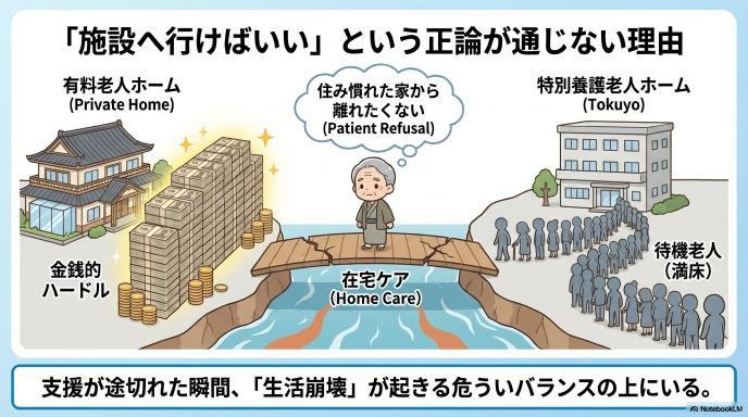 今回のSNSでの議論は、決して特殊な一例を切り取ったものではありません。訪問医療や介護の現場が日々直面している「在宅ケアが限界を迎える瞬間」を、非常にリアルな形で社会に突きつけました。その背景には、いくつかの複雑な要因が絡み合っています。