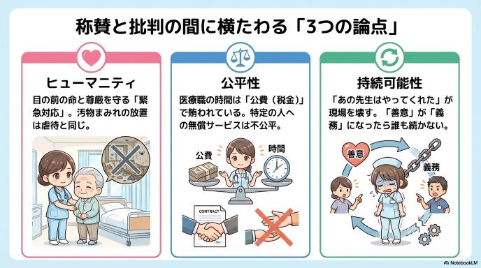 この話題に対して、なぜこれほどまでに世間の声が真っ二つに割れたのでしょうか。それは「どちらが100%正しいか」という問題ではなく、医療者としてのヒューマニティ(人道)と、社会システムとしての持続可能性という「異なるふたつの価値観が激しく衝突している」からです。具体的に3つの論点に分けて整理してみましょう。