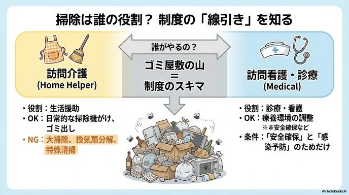 在宅ケアにおいて「誰がどこまで掃除をするのか」は、非常にデリケートな問題です。目の前の状況を善意だけで乗り切るのではなく、制度上のルールを知っておくことが、支援を長続きさせるための重要な鍵となります。
