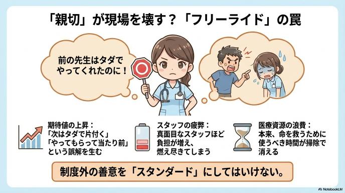 そして、現場の同業者たちが最も危惧しているのがこの点です。 「あのクリニックは、無料で大掃除までしてくれた」という事実が美談として広まると、「じゃあ、うちの親が粗相をしたときも片付けてもらえるはずだ」という過剰な期待を生み出しかねません。ただでさえ人手不足で激務の在宅医療・介護の現場において、こうした「制度外の善意」が暗黙のサービス(スタンダード)として求められるようになれば、真面目に働くスタッフほど疲弊し、結果的に地域全体の医療体制を壊してしまうリスクをはらんでいるのです。