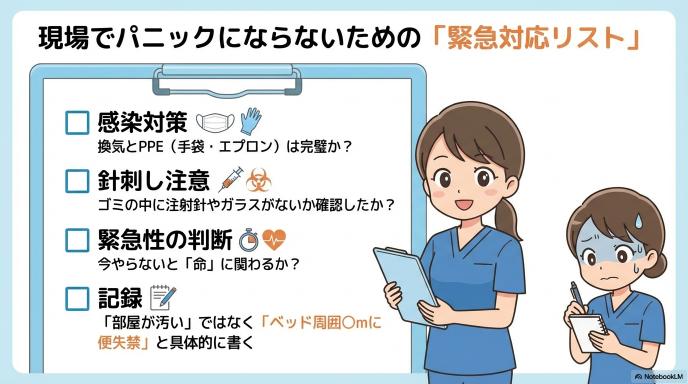 では、実際に訪問先で「足の踏み場もない状況」に直面したとき、現場の看護師はどう動くべきでしょうか。パニックにならず、安全かつ適切に対応するための実務チェックリストをまとめました。
